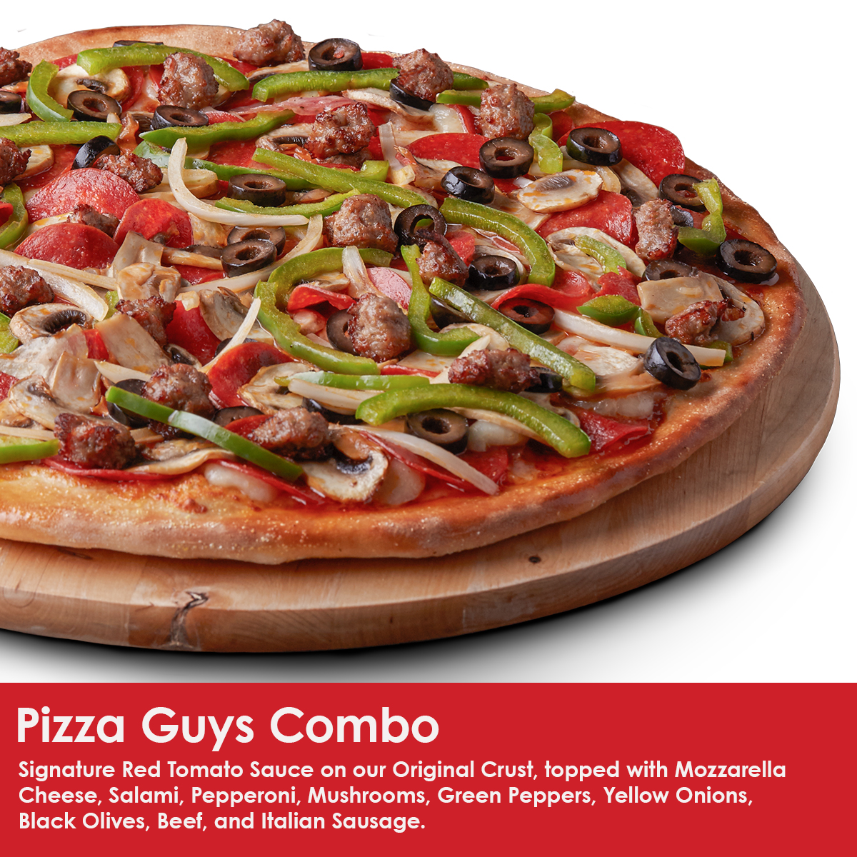 For those who adore a classic ensemble, the Pizza Guys Combo is an absolute must-try. Laden with salami, pepperoni, mushrooms, green peppers, and yellow onion on their original crust, this pizza showcases the traditional delights we all know and love, elevated by their signature red tomato sauce.