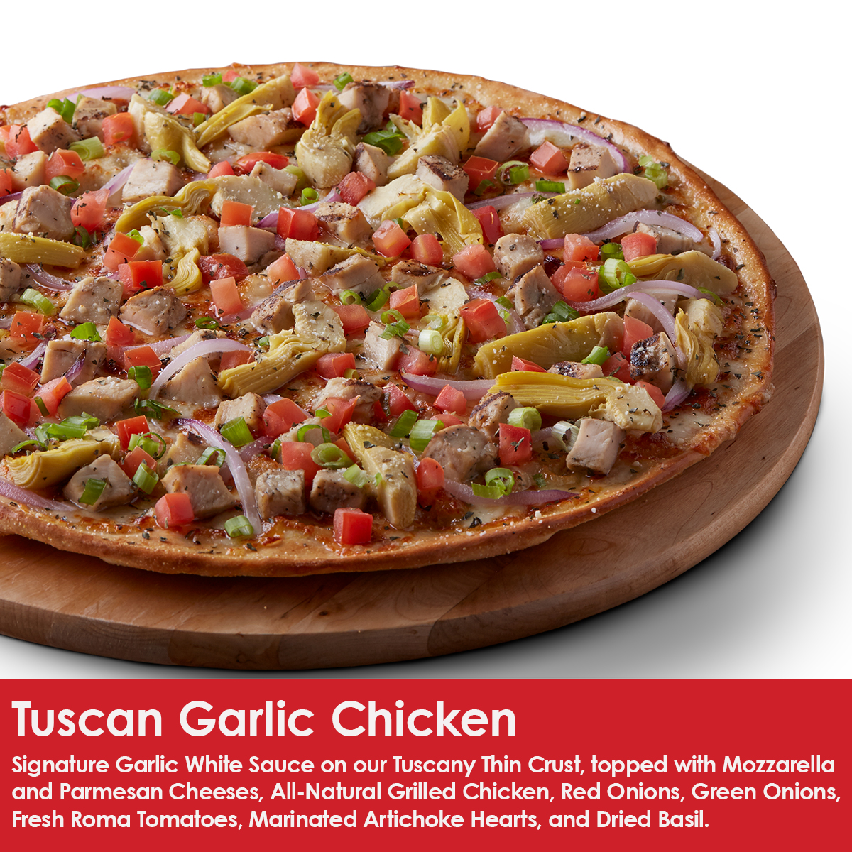 At Pizza Guys - Concord, the menu is a playground for pizza enthusiasts, featuring options for every palate. You can indulge in their signature Spinach Garlic Chicken Pizza, a masterpiece of flavors that come together seamlessly. With a base of garlic white sauce spread generously on their renowned Tuscany crust, this pizza is a treat topped with mozzarella, baby spinach, all-natural grilled chicken, marinated artichoke hearts, and chopped fresh garlic. It's a celebration of freshness and robust taste that will leave you craving more.